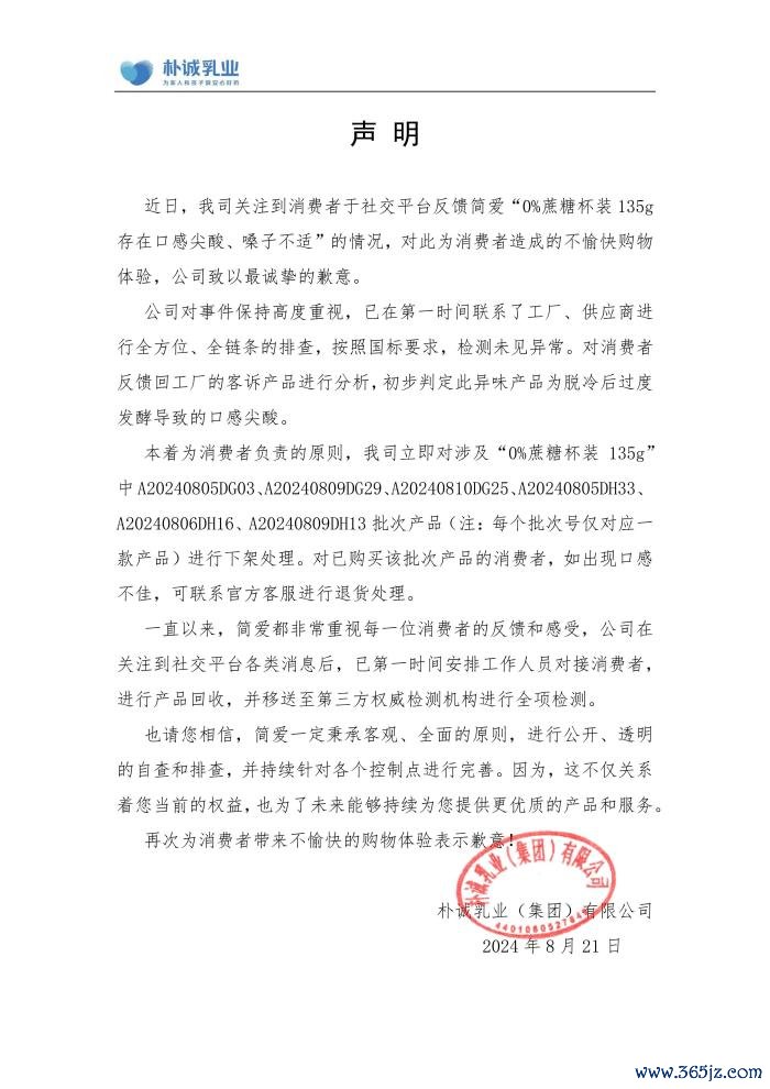 8月21日晚,简爱品牌所属公司朴诚乳业发布声明称,已第一时间联系了工厂、供应商进行排查股票杠杆网站,按照国标要求,检测未见异常。对消费者反馈回工厂的客诉产品进行分析,初步判定此异味产品为脱冷后过度发酵导致的口感尖酸。公司已对相关产品进行下架处理,已经购买了相关批次的消费者,如出现口感不佳,可联系官方客服进行退货。