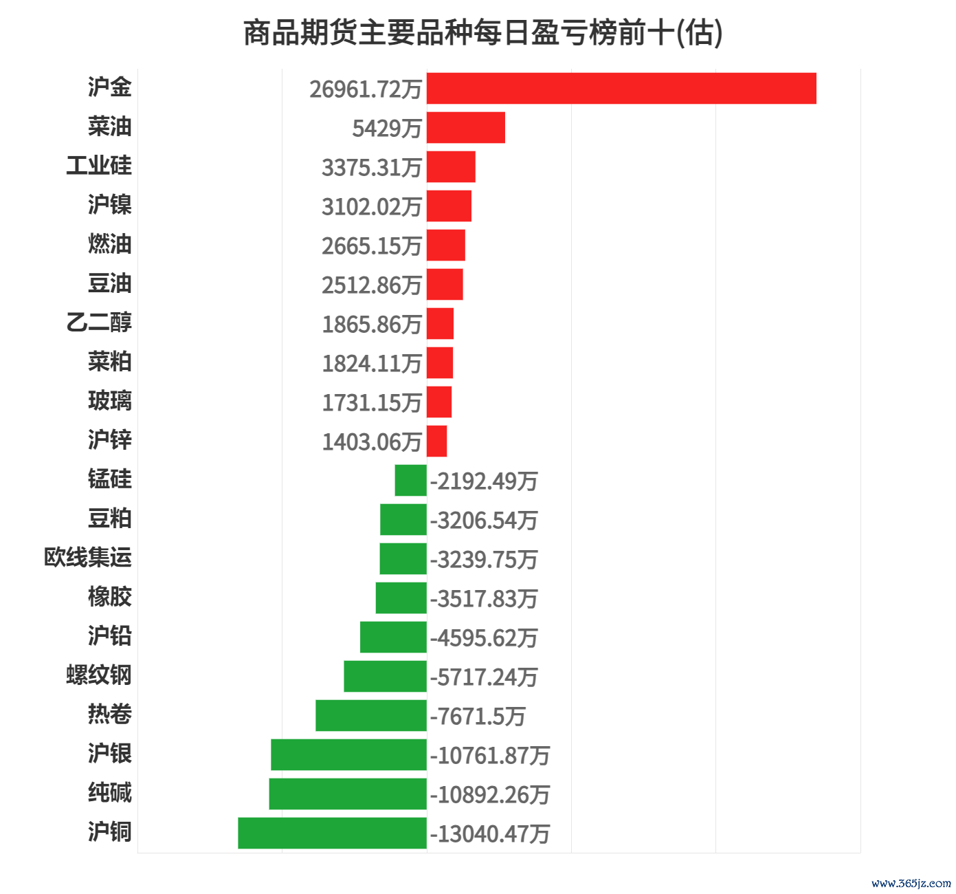 今日亏损前三品种为螺纹钢、棕榈油、十债,分别亏损6507.00万元、2919.04万元、2079.26万元。