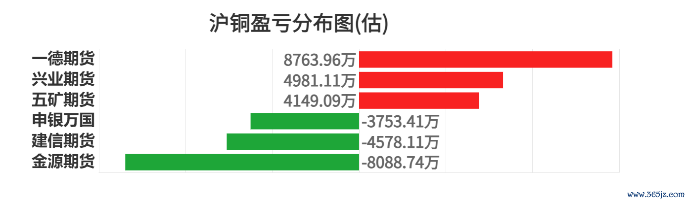就沪铜而言,今日盈利前三席位为一德期货、兴业期货、五矿期货,分别盈利8763.96万元、4981.11万元、4149.09万元。