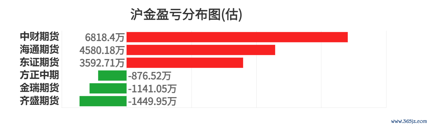 就沪金而言,今日盈利前三席位为中财期货、海通期货、东证期货,分别盈利6818.40万元、4580.18万元、3592.71万元。